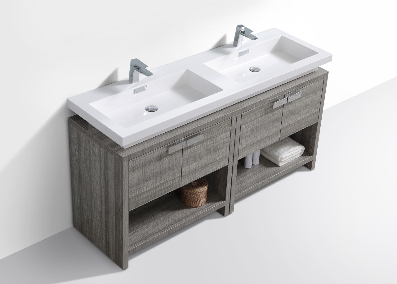 Levi 63″ Ash Gray Double Sink Modern Bathroom Vanity w/ Cubby Hole